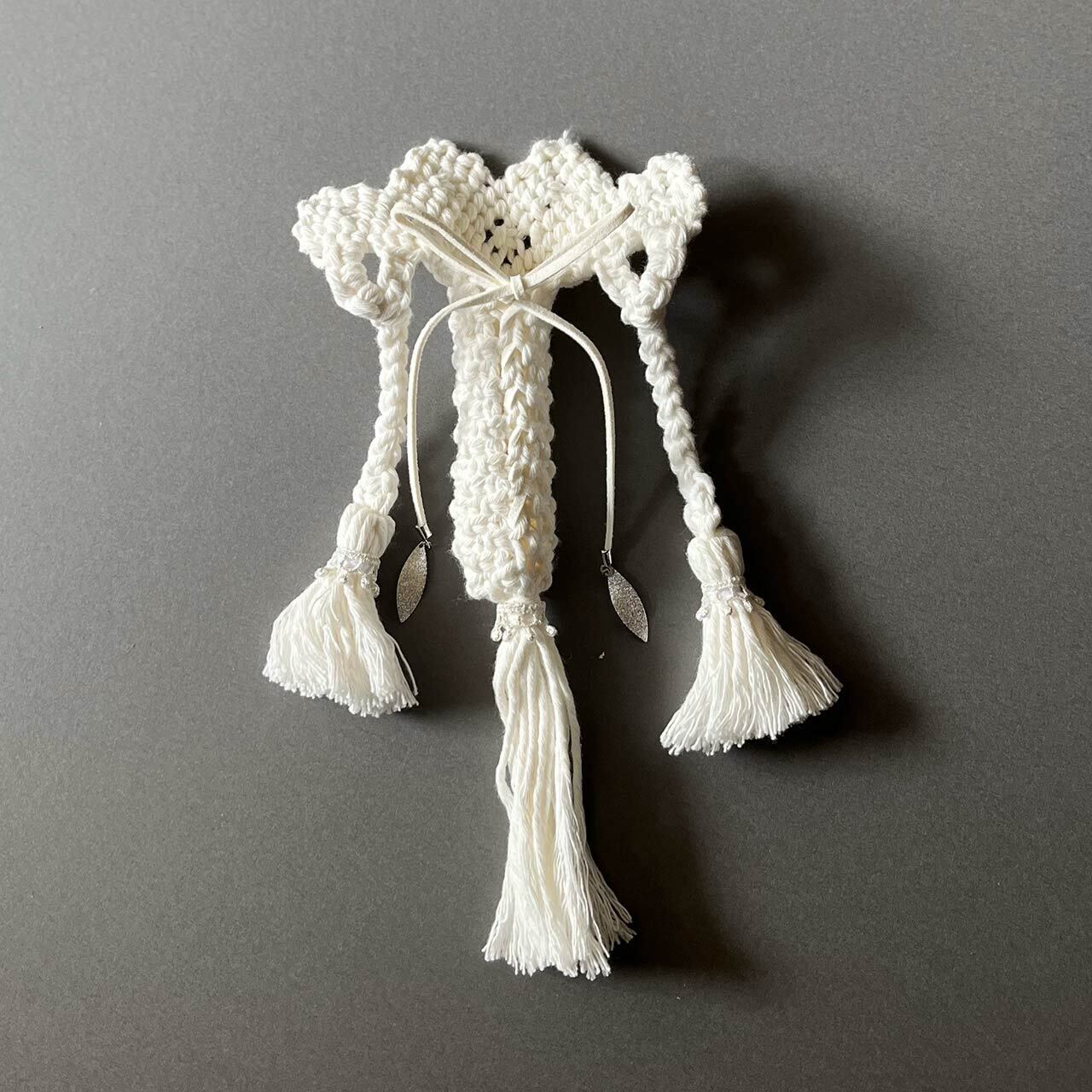 ホワイトの紐で結びあげたマクラメのブーケベースです。スエードの紐で結んでいるので、若干の太さ調整が可能です。